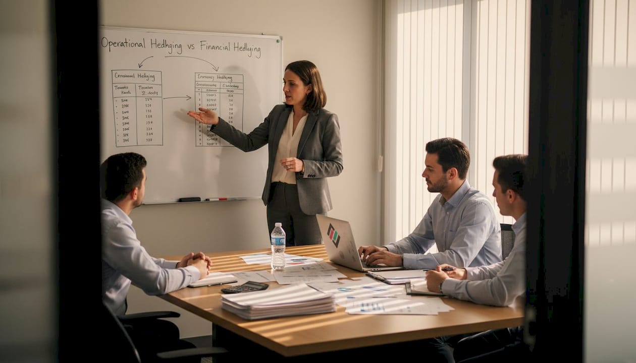 Financial hedging uses derivatives and market instruments to neutralize residual exposure after operational measures have been applied. The two approaches work together, not in competition.