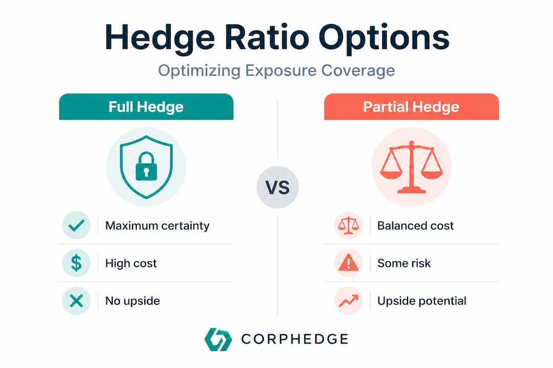 Choosing among these tools requires clarity on your hedge ratio: the proportion of your identified exposure you actually hedge. A 100% hedge ratio on every exposure sounds safe, but FX hedging programs are best framed as optimizing the trade-off among hedge cost, coverage ratio, and the risk-return role of the exposure, rather than defaulting to maximum coverage at all times.