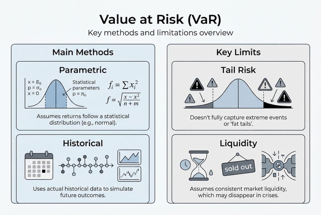 | VaR has limitations | VaR does not measure extreme losses, relies on market assumptions, and must be complemented with practical safeguards. |